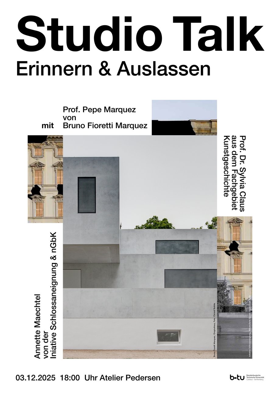 Es werden Prof. Pepe Marquez von Bruno Fioretti Marquez und Annette Maechtel von der Initiative Schlossaneignung und Direktorin der nGbK zu Gast sein. Das Büro BFM entwarf mit den neuen Meisterhäusern in Dessau eine gebaute Unschärfe, die durch originale Konturen und Fensteröffnungen an die ursprünglichen Gebäude erinnert. Die Initiative Schlossaneignung fordert die künstlerische Aneignung der Berliner Stadtschlossfassaden, die ausgelassene Spuren wieder sichtbar macht. Im Fokus des Abends stehen also Annäherungen und Interpretationen von Bestandsbauten, die verloren gegangen sind: Was gilt es zu erinnern, was ist im Sinne einer Neunutzung auszulassen und was wurde andersherum ausgelassen was es wieder zu erinnern gilt?