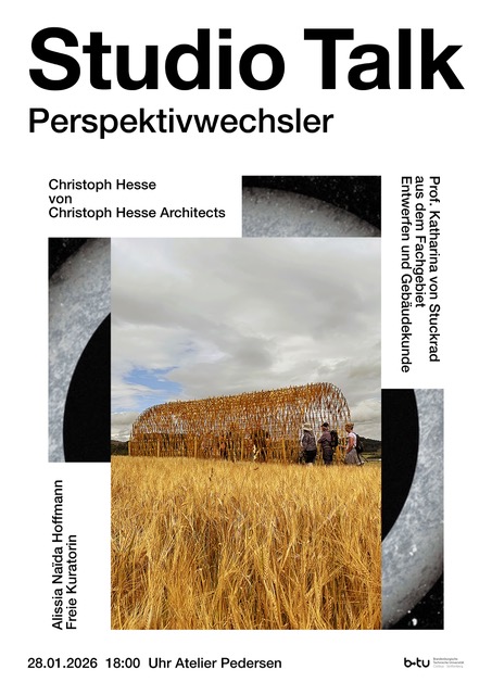 Wir laden euch/Sie herzlich zu unserem nächsten Studio Talk ein. Am Mittwoch, dem 28.01.26, wird der Architekt Christoph Hesse zu Gast sein. Er zeigt kleine Projekte, die er "Perspektivwechsler" nennt und wir machen diese zum Thema des Talks. Als zweite Vortragende konnten wir Alissia Naïda Hoffmann, freie Kuratorin und "Kommunikatorin" im Bereich der Architektur und (Raum)Gestaltung, gewinnen. Sie wird ihre Arbeit unter Anderem am DAZ in Berlin zeigen aber auch metaphorisch über Perspektivwechsler in Form der Sichtbarmachung und Aufbereitung architekturpolitischer Themen referieren. Die anschließende Diskussion wird von Prof. Katharina von Stuckrad bereichert.