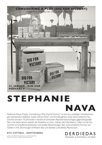 Im Rahmen des Vortrags stellt Stéphanie Nava das Projekt "Considering a Plot (Dig for Victory)" vor, das ab Ende Januar unter dem Titel "Graben für den Sie oder die Gärten des Überlebens" im dkw. Kunstmuseum Dieselkraftwerk Cottbus gezeigt wird.