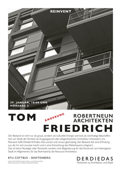DerDieDas ist eine interdisziplinäre Vortragsreihe der BTU Cottbus, Fakultät 2 für Architektur, Bauingenieurwesen und Stadtplanung, Lehrstuhl Baukonstruktion und Lehrstuhl Baukonstruktion und Entwerfen Prof. Dr. eh. (SPSUACE) Wolfgang Schuster.