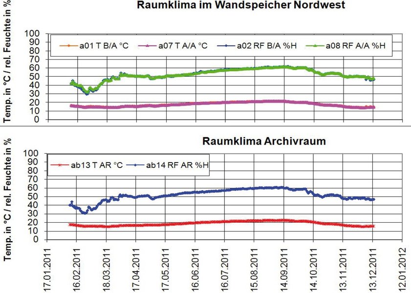 Bereits im zu Ende gehenden Förderprojekt haben sich sorptiv wirksame Innenoberfächen in einem auch messtechnisch betreuten Archivobjekt als förderlich erwiesen. Zementgebundene Holzspanplatten sind nach vorangegangenen, umfangreichen numerischen Simulationen und labortechnischen Voruntersuchungen hinsichtlich ihres hygrothermischen Verhaltens im Landeshauptarchiv Magdeburg zum Einsatz gelangt. Eine halbautomatische Messeinrichtung erlaubt sowohl die Sorptionsisotherme
