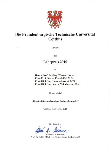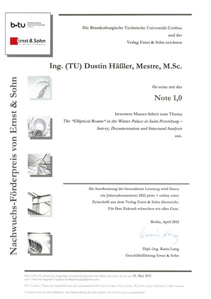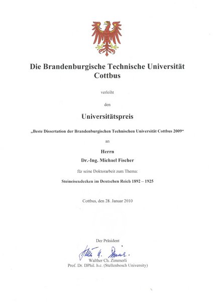 Universitätspreis für hervorragende akademische Leistungen für ihre Bachelor-Arbeit "Die spätgotischen Zellengewölbe in der Kapelle St. Petri in Brandenburg an der Havel" Link zur Mitteilung