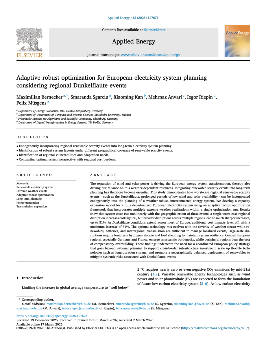 In einem aktuellen Beitrag in Applied Energy entwickeln Maximilian Bernecker, Smaranda Sgarciu, Xiaoming Kan, Mehrnaz Anvari, Iegor Riepin und Felix Müsgens ein adaptives Optimierungsmodell, das die langfristige Planung eines vollständig dekarbonisierten europäischen Stromsystems unter Unsicherheit untersucht.