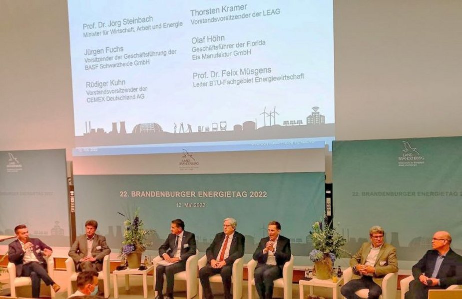 Auf dem Energietag des Landes Brandenburg an der BTU in Cottbus diskutierten Brandenburgs Energieminister Jörg Steinbach, Jürgen Fuchs (Vorstandsvorsitzender BASF Schwarzheide), Rüdiger Kuhn (Vorstandsvorsitzender CEMEX), Olaf Höhn (Geschäftsführer Florida Eis Manufaktur), Prof. Dr. Felix Muesgens (BTU Cottbus-Senftenberg) und LEAG-Vorstand Thorsten Kramer über Wege zur klimafreundlichen Transformation der brandenburgischen Wirtschaft - bei gleichzeitiger Versorgungssicherheit und Abkehr von russischen Gas- und Ölimporten.