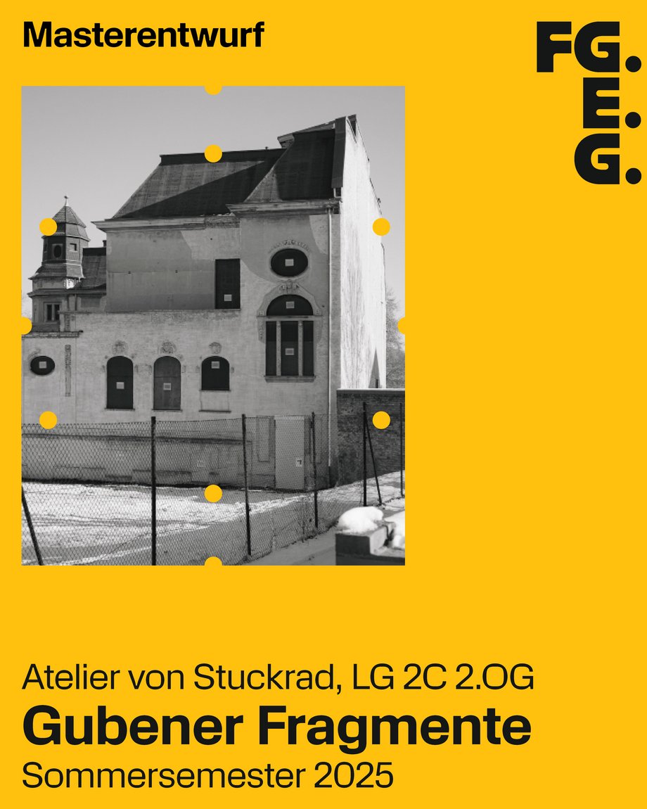 Guben ist eine kleine Grenzstadt, die von ihrer polnischen Zwillingsstadt Gubin durch die Neiße getrennt wird. Als ehemaliger hoch entwickelter Standort der Textil- und Chemie- industrie hat die Stadt seit der Deindus- trialisierung in den 1990er Jahren mit Problemen des demografischen Wandels zu kämpfen. Von einer Epoche der wirtschaftlichen Blüte künden heute verlassene Bauwerke und Industriedenkmäler wie das Haus D der Tuchfabrik Carl Lehmanns Witwe & Sohn, das Gerichtsgefängnis oder die im Abbruch befindliche Tuchfabrik Wolf, die den ehemaligen Status der Stadt noch erahnen lassen. Ausgangspunkt des Semesters ist eine Auseinandersetzung mit Fragmenten einer vormals industriell geprägten Stadtstruktur. Dabei richten wir unsere Aufmerksamkeit auf die architektonischen Artefakte mit Ihren prägenden Elementen wie Maßstab, Typus, Gestalt, Struktur, Konstruktion und Material. Wie kann der bauliche Bestand neu gelesen und weitergeschrieben werden und inwiefern können Leerstände und Brachen zu Kata- lysatoren für eine neue Belebung des städt- ischen Raumes werden.
