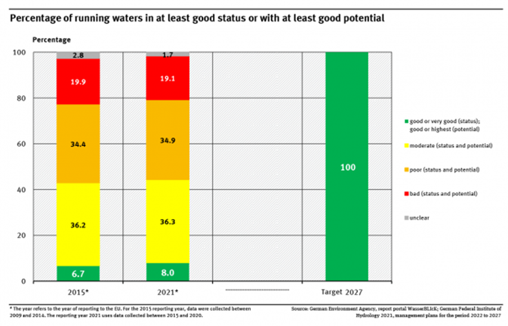 Eine der Hauptaufgaben der Wasserrahmenrichtlinie der Europäischen Union ist die Bewertung aquatischer Ökosysteme und die Beurteilung ihres ökologischen Zustands. Bei einem Zustand unterhalb von „sehr gut“ und „gut“ müssen Restaurierungsmaßnahmen ergriffen werden, um die Gesundheit des Ökosystems zu verbessern. Leider erfüllten bei der letzten Bewertung des ökologischen Zustands der Flüsse in Deutschland im Jahr 2021 nur 8 % die Zielvorgaben für einen sehr guten oder guten Zustand. Tatsächlich wurde mehr als die Hälfte der bewerteten Fließgewässer als schlecht oder sogar sehr schlecht eingestuft. Es sind also umfangreiche Maßnahmen erforderlich, um die Flussökosysteme zu erhalten und ihre Funktionen wiederherzustellen, damit sie zu gesunden Ökosystemen werden.