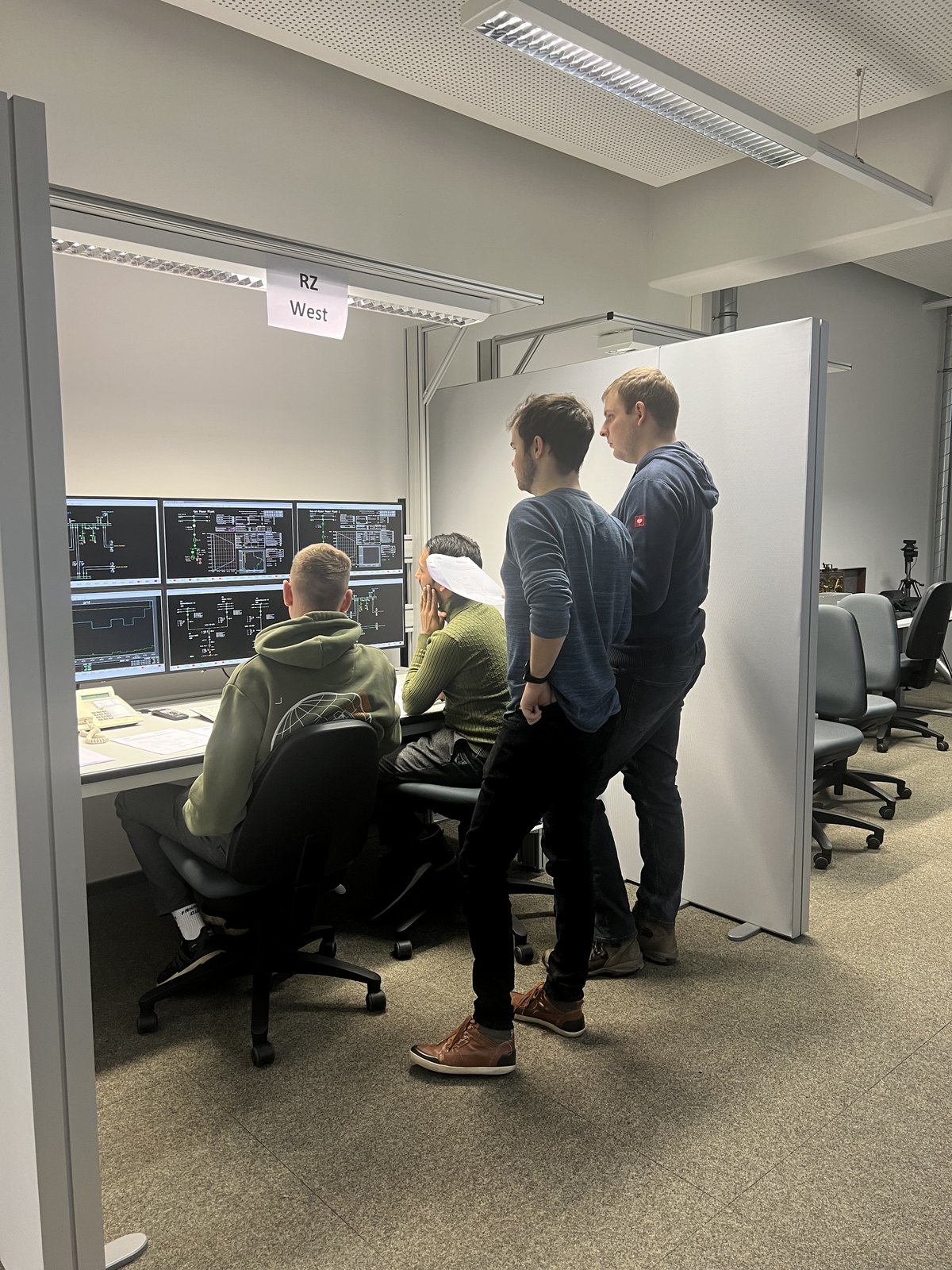 Die Veranstaltung wurde in zwei Blöcke unterteilt. Im ersten Block stellte Hr. Blank von der 50HzT in einem Vortrag die Arbeit der diensthabenden Schicht- und Systemingenieure im TCC vor. Neben den Aufgaben und Arbeiten, um das System während einer Schicht zu führen, beinhaltete der Vortrag auch einen Überblick zu den umfangreichen vorbereitenden Tätigkeiten und Planungen. Im zweiten Block wurden Betriebsführungs- und Schaltaufgaben an die Studenten gestellt, die am Netztrainingssimulator des Lehrstuhls Energieverteilung und Hochspannungstechnik zu bearbeiten waren. Dazu wurden die Studenten in Gruppen eingeteilt, um nacheinander an drei verschiedenen Trainingsszenarien zu arbeiten. Die Aufgaben wurden dabei so gestellt, dass die präventive Denk- und Arbeitsweise eines Netzbetreibers zum Vorschein kam.