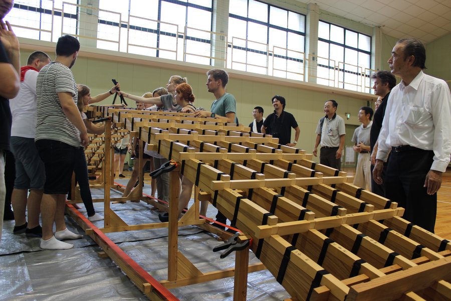 Am folgenden, dem 7. Tag waren wir an der Kintai-kyo Bridge, das 1673 von Yoshikawa Hiroyoshi erdacht und erstmals errichtete Holztragwerk wird zur Überlieferung der Bautradition nach einigen Jahrzehnten immer wieder neu errichtet. Vor der Besichtigung des historischen Tragwerks erläuterte uns Prof. Teruhiko Yoda die besondere Bauweise der Brücke mit japanischen Holzverbindungen. Er ermöglichte, dass wir anlässlich unseres Besuchs ein maßstäbliches Modell der Brücke zusammenbauen konnten. Durch das eigenhändige Zusammensetzen des Bogentragwerks wurde für uns die Tragstruktur detailliert begreifbar. Am Nachmittag führte uns die Exkursion ins Hiroshima Peace Memorial Museum von Kenzo Tange. An diesem Ort bekamen wir eine Ahnung vom unfassbaren Ausmaß der Zerstörungskraft einer Atombombe. Die Gedenkstätte zeigt ein differenziertes Bild der japanischen Geschichte und kritisiert den Militarismus der frühen Showa-Zeit.