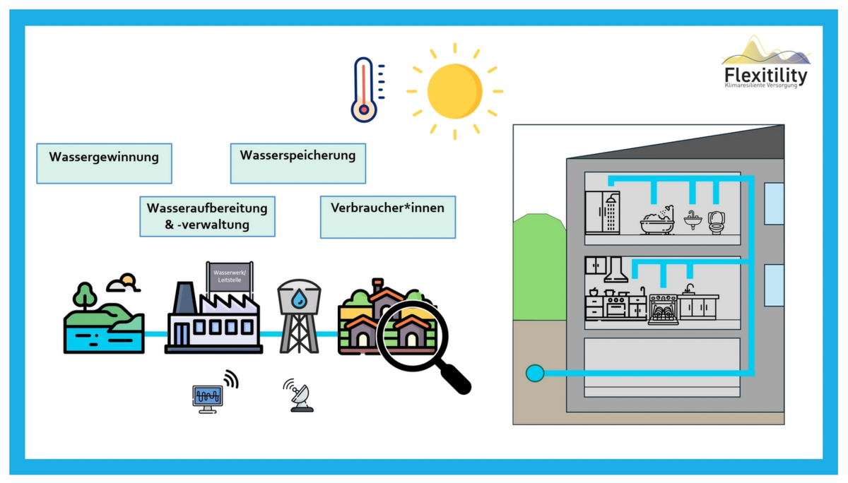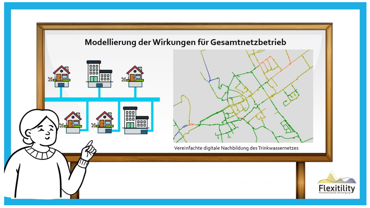Was nützen die besten Forschungserkenntnisse, wenn diese nicht bekannt sind oder nicht verstanden werden? Aufgabe der Arbeiten im Arbeitspaket „Capacity Building und Transfer” des Projektes Flexitility war es, das erarbeitete Wissen transparent und einfach verständlich darzustellen und niederschwellig verfügbar zu machen. Mit diesem Ziel wurden der Anlass der Forschung, die Funktionsweisen der Pilotanlagen und zentrale Erkenntnisse in kurze Lernvideos überführt. Damit soll das Konzept der dezentralen Trinkwasserzwischenspeicher einer breiten Zielgruppe – von kommunalen Wasserversorgungsunternehmen bis zu Endverbraucher:innen – leicht verständlich kommuniziert werden. Diese Videos sind hier zu finden.
