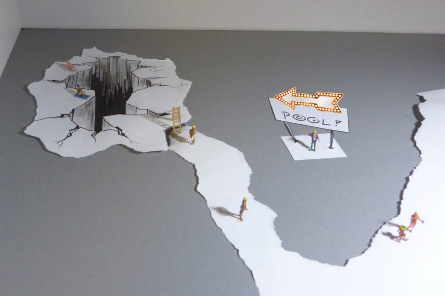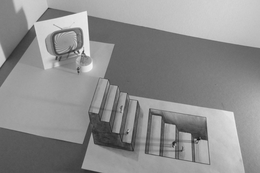 Malerei, dreidimensionale Dinge, reale Menschen, Collagen etc. soll hier gemischt und mit der Fotgrafie oder Druckgrafik zu einem geschlossenen, suggestiven Ganzen gezurrt werden, das den Betrachter in einen Irrgarten der Täuschungen führt.