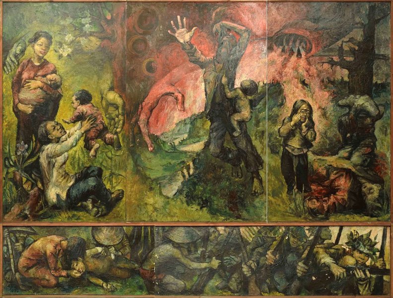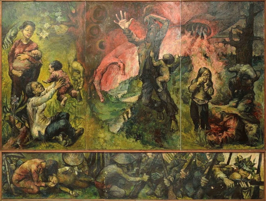 Die erste Ebene des Zeigens befasst sich mit den Werken selbst. Entlang wiederkehrender Leitmotive soll in exemplarischen Werkanalysen untersucht werden, wie Künstler:innen in der DDR den Vietnamkrieg repräsentiert haben. Mithilfe welcher Formen, Mittel und inhaltlichen Bezüge visualisierten sie den Krieg und welche gesellschaftliche Bedeutung barg ihr fiktionaler und ideologischer Gehalt?