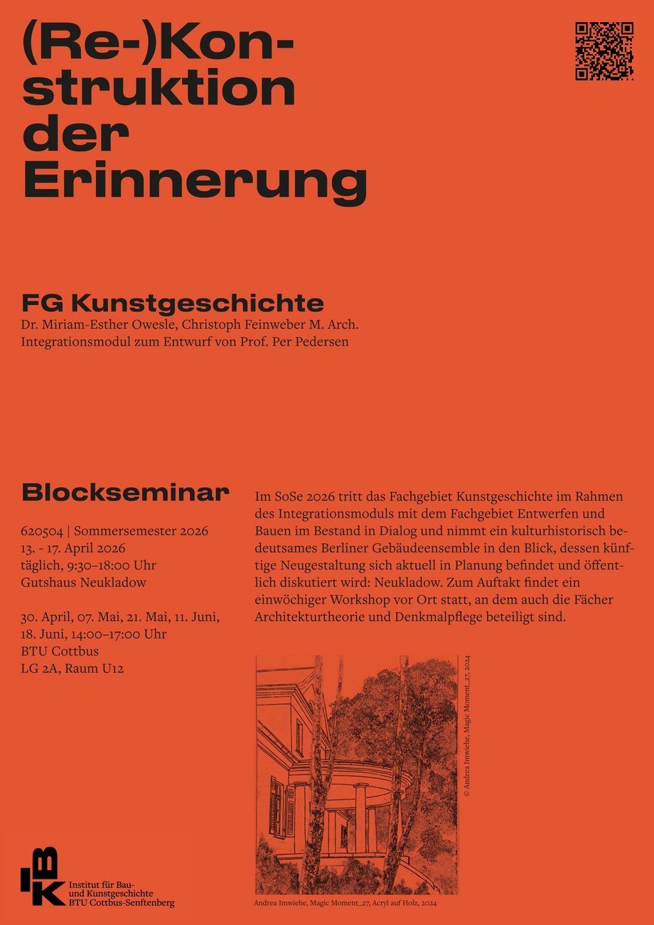 Im SoSe 2026 tritt das Fachgebiet Kunstgeschichte im Rahmen des Integrationsmoduls mit dem Fachgebiet Entwerfen und Bauen im Bestand in Dialog und nimmt ein kulturhistorisch bedeutsames Berliner Gebäudeensemble in den Blick, dessen künftige Neugestaltung sich aktuell in Planung befindet und öffentlich diskutiert wird: Neukladow. Zum Auftakt findet ein einwöchiger Workshop vor Ort statt, an dem auch die Fächer Architekturtheorie und Denkmalpflege beteiligt sind.