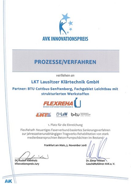 Beim diesjährigen AVK Innovationspreis konnte sich die Partnerschaft aus der LKT Lausitzer Klärtechnik GmbH und dem Fachgebiet Leichtbau mit strukturierten Werkstoffen der BTU Cottbus-Senftenberg gegen die Konkurrenz durchsetzen und mit dem Projekt "FlexReha®- Neuartiges Faserverbund-basiertes Sanierungsverfahren zur jahreszeitenunabhängigen Tragwerks-Rehabilitation von stark beanspruchten Beton-Pumpschächten im Bestand" den ersten Platz in der Kategorie Prozesse/Verfahren erringen.