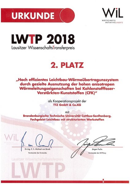 Beim diesjährigen 7. Lausitzer WissenschaftsTransferpreis (LWTP) der Wirtschaftsinitiative Lausitz e.V. (WiL) hat sich die Kooperation zwischen der TTZ GmbH & Co.KG und dam Fachgebiet Leichtbau mit strukturierten Werkstoffen von Herrn Prof. Seidlitz ausgezahlt. Mit ihrem Projekt "Hoch effizientes Leichtbau-Wärmeübertragungssystem durch gezielte Ausnutzung der hohen anisotropen Wärmeleitungseigenschaften bei Kohlenstofffaser-Verstärkten-Kunststoffen (CFK)" konnten sie sich unter zahlreichen Teilnehmern durchsetzen und am Ende den zweiten Platz mit nach Hause nehmen.