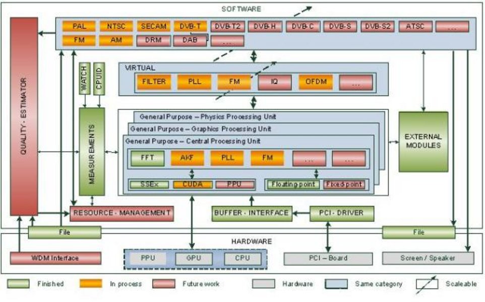 Ein softwaredefinierter Empfänger ist ein Empfänger, in dem die starren Hardwarekomponenten weitestgehend durch Softwarekomponenten ersetzt wurden. In Abhängigkeit der noch verbliebenden Hardwarekomponenten spricht man auch von einem Software-Empfänger oder idealen Software-Empfänger. Der im folgenden betrachtete Empfänger wird als softwaredefinierter Empfänger eingestuft, da der Hardwareteil lediglich aus einem rauscharmen Verstärker (LNA), einem Überlagerungsempfänger (IF-Tuner) und einem Analog-zu-Digital-Umsetzer (ADC) besteht. In Abhängigkeit des Frequenzbereichs des verwendeten Tuners kann damit jeder Rundfunkstandard durch Software nach-gebildet werden. Die Vorteile eines solchen softwaredefinierten Empfängers sind Flexibilität und unkomplizierte Inbetriebnahme auf der Kundenseite sowie Kostenreduzierung, kurze Ent-wicklungszeiten und auch hohe Flexibilität auf Herstellerseite. Als einziger Nachteil bleibt der verhältnismäßig hohe Rechenaufwand der nur von ent¬sprechend leistungsfähigen Prozessoren erbracht werden kann. Wird ein solcher softwaredefinierter Empfänger dann noch primär auf Universalprozessoren (GPPs - General Purpose Processors) eingesetzt, bedarf es einer kundengerechten Lösung zur Reduzierung des erwähnten Nachteils, da der Hauptvorteil der Flexibilität durch eine ständige An¬passung an den Prozessor verloren gehen würde. Hierfür bietet sich ein skalierbares System (siehe Abb.) an, dass in Abhängigkeit der zur Verfügung stehenden Ressourcen die Qualität des Empfängers anpasst und damit den benötigten Rechenaufwand variiert. Die Anpassung der Qualität kann hierbei durch unterschiedliche Parameter der verwendeten Softwaremodule und/oder durch speziell entwickelte skalierbare Module realisiert werden.