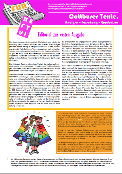 Die Stadt Cottbus (niedersorbisch Chóśebuz) wird häufig als Hochburg der extremen Rechten beschrieben. Was demgegenüber jedoch häufig in Vergessenheit oder in den Hintergrund gerät: Viele Cottbuser*innen engagieren sich seit vielen Jahren gegen die rechte Dominanz in der Stadtgesellschaft. Die Cottbuser Texte wollen diese Vielfalt darstellen und sichtbar machen sowie damit im Zusammenhang stehenden Forschungsfragen nachgehen. Zudem richten wir den Blick auf extrem rechte Akteure sowie auf die Ausprägung menschenfeindlicher Ideologien in der Mehrheitsgesellschaft. Die Schriftenreihe erscheint halbjährlich unter dem Dach der Forschungs- und Transferstelle (sozial)pädagogische und zivilgesellschaftliche Gegenstrategien im Umgang mit der extremen Rechten (FUR) am Institut für Soziale Arbeit der BTU Cottbus-Senftenberg.
