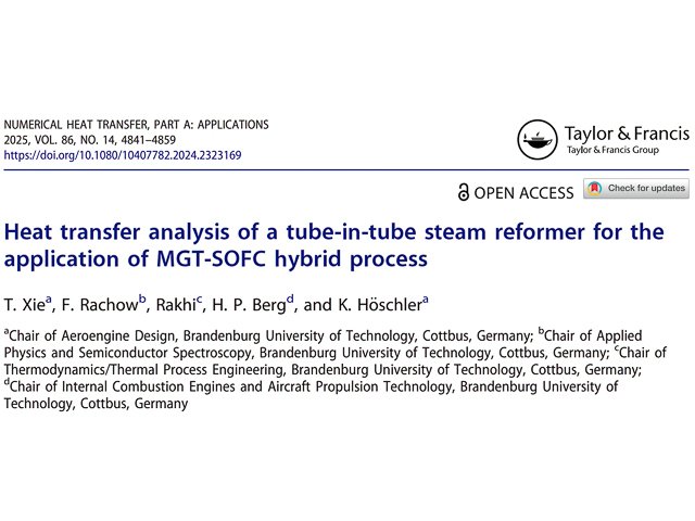 Ein Artikel mit Koautoren der Fachgebiete Flug-Triebwerksdesign, Thermodynamik/Thermische Verfahrenstechnik und Verbrennungskraftmaschinen und Flugantriebe wurde von der Zeitschrift »Numerical Heat Transfer« zur Veröffentlichung akzeptiert und ist online verfügbar.