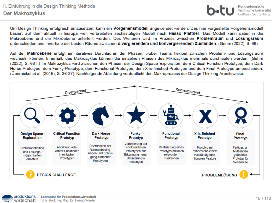 Diese Studie entstand im Kontext des Forschungsprojekts „SpreeTecneXt“. Ziel war es, durch den Design Thinking Ansatz innovative und nachhaltige Lösungen für die dezentrale Energietechnik zu entwickeln. Drei konkrete Fallstudien wurden auf Basis der Design Thinking-Methode durchgeführt: ein Reinigungssystem für PV-Module, ein nachsteuerndes Floating-PV-System und eine nachhaltige mobile Parkbox. Die Methode Design Thinking zeichnet sich durch ihren nutzerzentrierten, iterativen und kreativen Prozess aus, der besonders in unsicheren und dynamischen Marktumfeldern geeignet ist, komplexe Herausforderungen zu bewältigen. Im Rahmen der durchgeführten Projekte wurde der Design Thinking Ansatz nach Hasso Plattner angewendet. Die Ergebnisse dieses Projekts liefern sowohl praktische Erkenntnisse als auch methodische Anregungen für zukünftige Forschungs- und Entwicklungsarbeiten im Bereich der Energietechnik Innovationen und fördern gleichzeitig den Wissensaustausch zwischen akademischer Forschung und industrieller Praxis. Download