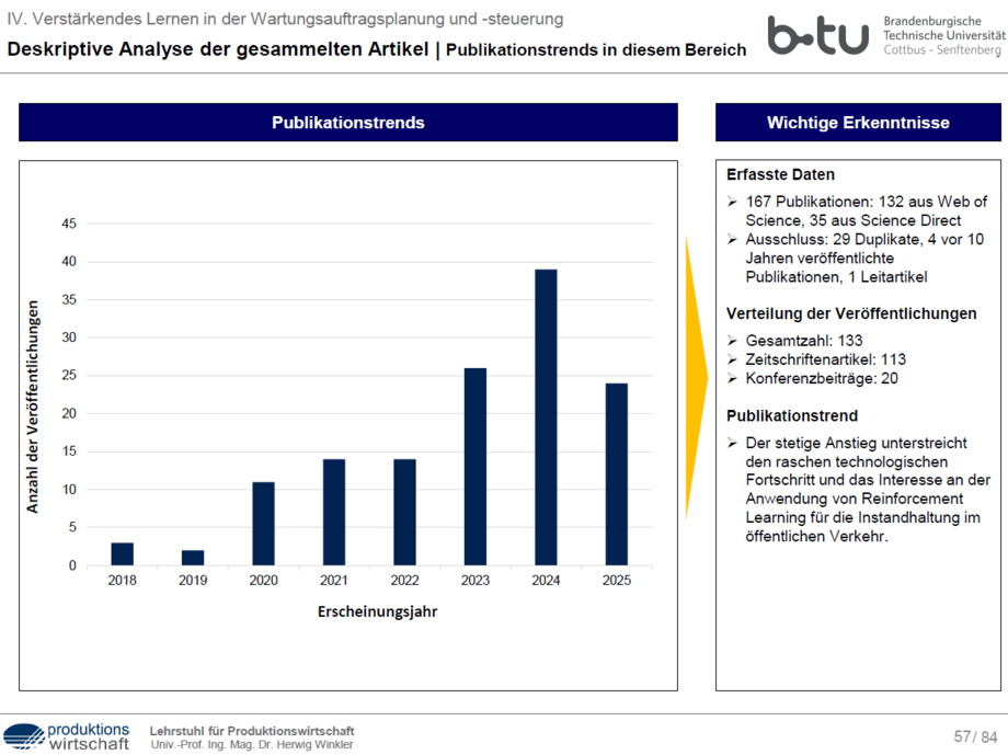 Durch eine sorgfältige Instandhaltung von Zügen, Bussen und Flugzeugen lässt sich die Verfügbarkeit, Betriebssicherheit und Wirtschaftlichkeit dieser Verkehrsmittel maßgeblich sichern. Bislang wurden die dafür relevanten planungsintensiven Prozesse in Zugwerkstätten mit herkömmlichen statischen Planungssystemen durchgeführt. Diese Systeme bilden zwar eine Grundlage für die Organisation der Instandhaltungsarbeiten, sind jedoch nicht in der Lage, optimierte Instandhaltungsprogramme zu erstellen. Infolgedessen treten während der tatsächlichen Durchführung der Instandhaltungsmaßnahmen häufig ungeplante Zusatzaufgaben auf, die den Arbeitsablauf in den Instandhaltungswerkstätten stören und sowohl die wirtschaftliche als auch die betriebliche Effizienz beeinträchtigen. Es hat sich gezeigt, dass solche Störungen häufig zu erhöhten Instandhaltungskosten, längeren Durchlaufzeiten und einer verminderten Anlageneffizienz führen. Daher besteht ein wachsender Bedarf, bei der Instandhaltungsplanung und -steuerung im öffentlichen Verkehrssektor von statischen zu dynamischeren, datengesteuerten Ansätzen überzugehen. Künstliche Intelligenz (KI) bietet in dieser Hinsicht ein erhebliches Potenzial, da sie die Entwicklung von Vorhersagefähigkeiten, dynamischer Planung und intelligenter Ressourcenzuweisung erleichtert. Download