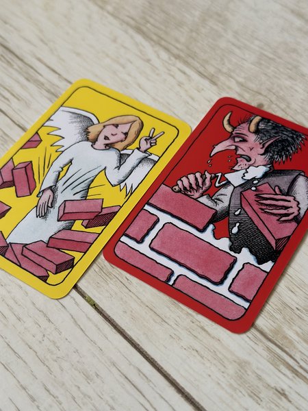 Das Kartenspiel besteht aus je 18 Teufels- und 18 Engelskarten. Es können insgesamt 16 Paare gebildet werden, wobei die Spieler:innen die Probleme auf den Teufelskarten erkennen und mit Hilfe der Engelskarten lösen müssen. So schafft jede:r Spieler:in gedanklich ein Stück Barrierefreiheit. Man sollte sich aber nicht vom ersten Blick täuschen lassen. Die Teufels- und Engelskarten werden als getrennte Stapel gut gemischt und jede:r Mitspieler:in erhält verdeckt 4 Engelskarten. 4 Teufelskarten werden offen auf den Tisch gelegt. Im Uhrzeigersinn wird nun gespielt und mit den passenden Engelskarten werden Teufelskarten einfach einkassiert und somit die bestehende Barriere überwunden. Der/die handelnde Spieler:in erklärt den anderen den Kartenzusammenhang und legt das Pärchen vor sich offen auf den Tisch. Nun fehlende Teufelskarten werden vom Kartenstock genommen und wieder offen auf den Tisch gelegt, damit immer 4 Karten offen vorhanden sind. Der/die nächste Spieler:in ist dran. Wenn keine Barriere überwunden werden kann, muss der/die Spieler:in zuerst eine offen liegende Teufelskarte mit einer Karte vom Teufelsstock austauschen und eine Engelskarte vom Engelsstock ziehen und schon ist der/die nächste Spieler:in dran. Gewonnen haben die Spielenden, die zuerst keine Karten mehr in der Hand halten. Nun gibt es noch Besonderheiten. Die vielen vom Teufel geschaffenen Barrieren sind zwar schon schlimm genug, aber es gibt zusätzlich noch 2 ganz teuflische Karten, die den Besitzenden eine Runde aussetzen lassen. Diese teuflische Karte wird dann gegen eine normale Teufelskarte vom Stock getauscht und es geht mit dem/der nächsten Spieler:in weiter. Aber auch die Engelskarten verfügen über 2 besondere Überraschungskarten. Wer den besonderen Inklusionsengel bekommt oder zieht, darf eine von seinen Karten mit dieser Engelskarte unter dem Engelsstock ablegen. Es gilt dabei taktisch abzuwägen, ob dieser Schritt gleich mit der ersten Möglichkeit vollzogen wird. Er kann auch als Überraschungsmoment bis zum Schluss aufbewahrt werden oder kommt als mögliche Ersatzspielhandlung zum Einsatz, wenn keine Karte mit einer Barriere entfernt werden kann. Bei 4 Spieler:innen sollte nur mit jeweils 3 Karten gespielt werden.