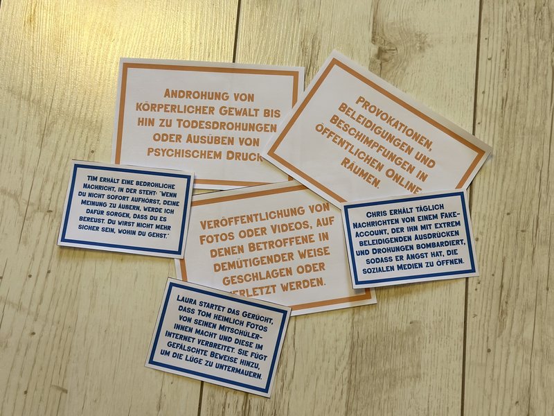 Das Spiel besteht aus Gesichter-Karten, die verschiedene Arten des Cybermobbings repräsentieren. Jedes Gesicht trägt den Namen einer spezifischen Form. Orangefarbene Karten enthalten detaillierte Beschreibungen der Cybermobbing-Formen. Die Spieler:innen versuchen nun, die Gesichter einer orangefarbenen Beschreibungskarte zuzuordnen. Ziel ist es, die passende Beschreibung zu jedem Gesicht zu finden. Im letzten Schritt geht es darum, die blauen Karten mit konkreten Praxisbeispielen der jeweiligen Form zuzuordnen. Zusätzlich können sich die Spielenden auch eigene Beispiele ausdenken. Auf der Rückseite jedes Teils finden sich Farbpunkte zur Fehlerkontrolle: Teile derselben Farbe gehören zusammen. Dies fördert nicht nur das korrekte Zuordnen, sondern ermöglicht auch eine einfache Selbstkontrolle.