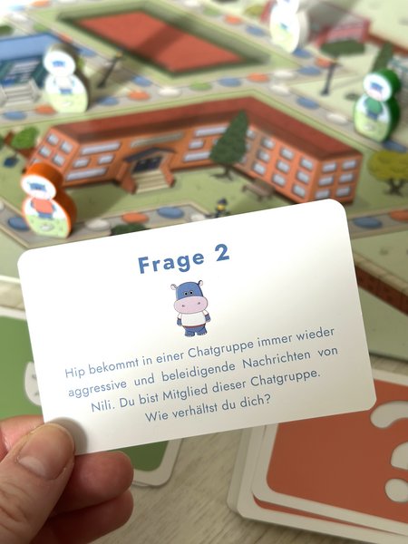 Auf orangefarbenen Fragekarten sind generelle Fragen zu (Cyber-) Mobbing und dem Umgang mit Medien formuliert. Auf den blauen Nilpferd-Karten sind verschiedene Situationen beschrieben, für die Lösungen gesucht werden sollen. Ergänzt wird dies durch Rollenspiele, durch welche die Mitspielenden Lösungen finden müssen, um dem Mobbing entgegenzuwirken. Die Spieler:innen, die die meisten Fragen richtig beantworten, sammeln die meisten Punkte und gewinnen das Spiel.