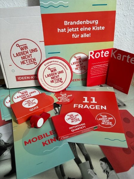 In Zusammenarbeit mit dem Aktionsbündnis Brandenburg ist im Rahmen der Kampagne „Wir lassen uns nicht hetzen – Wir bleiben solidarisch!“ eine Ideenkiste entstanden: Eine praktische Sammlung aus Materialien und Impulsen, die zeigt, wie wir gemeinsam Haltung zeigen können – laut, kreativ und entschlossen. Die Kiste enthält alles, was Mut macht, Gemeinschaft stärkt und hilft, sich gegen Hetze, Einschüchterung und Ausgrenzung zu positionieren – für ein vielfältiges und offenes Brandenburg.