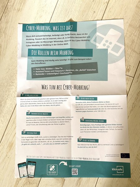 Das Poster „Was tun bei Cyber-Mobbing?“ von klicksafe bietet Kindern und Jugendlichen kompakte Informationen über das Thema Cybermobbing sowie praktische Tipps, wie man sich verhalten sollte, wenn man selbst von Mobbing betroffen ist oder Zeuge/Zeugin davon wird. Entwickelt wurde das Poster als Ergänzung zur Cyber-Mobbing-Erste-Hilfe-App, die von Mitglieder des klicksafe Youth Panel entwickelt und programmiert wurde. Die App, die seit September 2020 mit einem neuen Design und zusätzlichen Informationen zum Thema Cybermobbing verfügbar ist, kann in den gängigen App-Stores heruntergeladen werden. Ein QR-Code mit einer entsprechenden Verlinkung findet sich auch auf dem Poster.