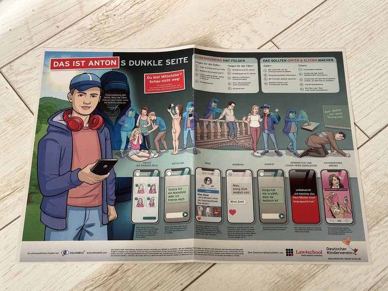 Cybermobbing ist ein ernstes gesellschaftliches Problem, das insbesondere in der digitalen Ära stark zugenommen zu haben scheint. Unser Labor für Didaktik und Methoden möchte dazu beitragen, das Bewusstsein für dieses Thema zu schärfen. Die ausleihbaren Poster eignen sich hervorragend für Schulen, Gemeindezentren, Organisationen oder Veranstaltungen, die sich mit der Prävention von Cybermobbing beschäftigen. Das Dialogbild auf dem Poster des Deutschen Kindervereins fokussiert sich auf den Täter Anton, der anonym agiert. Das Poster zeigt dabei die vielfältigen Formen des Cybermobbings – von der Verbreitung persönlicher Informationen und Fotos über die Erstellung von Fake-Profilen bis hin zu Beleidigungen, Verleumdungen und Nötigungen.