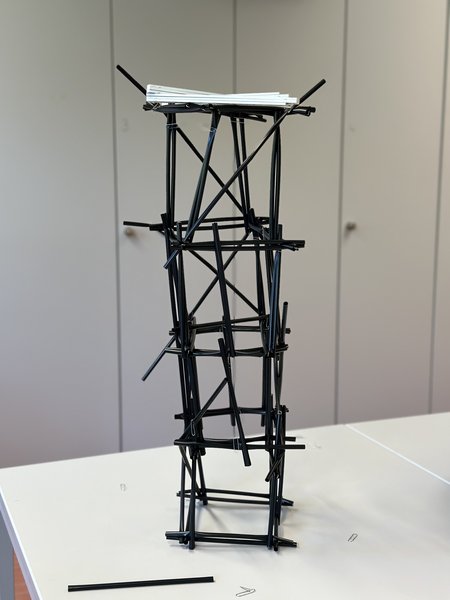 Die Aufgabe besteht darin, einen 1m hohen Turm aus Büroklammern und Strohhalmen gemeinsam als Team zu bauen. Die Teammitglieder entscheideen selsbt, wann sie mit dem eigenen Turm zufrienden sind und auf ihre Konstruktion vertrauen. Die „Prüfung” erfolgt in 2 Schritten: Misst der Turm 1m Höhe? Ist der Turm so robust, dass der Zollstock 1 Minuten darauf liegen bleiben kann? Sofern der Turm den Test aushält, gilt die Übung als erfolgreich bestanden. Für den Bau des Turmes gib es verschiedene Bauvarianten. Entscheidend ist also, dass sich die Gruppe gut untereinander über die Vorgehensweisen abstimmt. Ebenso werden die Rollen der Gruppenmitglieder durch das Spiel offenbart. Wer übernimmt die Kontrolle? Wer bringt aktiv Vorschläge ein? Wer lässt sich leicht überzeugen? Wer hält sich im Hintergrund? Der/die Schiedsrichter:in beobachtet die Vorgehensweisen der Teams und deren Rollen. Anschließend findet eine gemeinsame Reflexion statt. Alternativ kann auch eine Gruppe dazu eingesetzt werden, die Rolle des/der Beobachter:in zu übernehmen. Dabei könnte beispielsweise jede/r Spieler:in eine/n andere/n Spieler:in beobachten.
