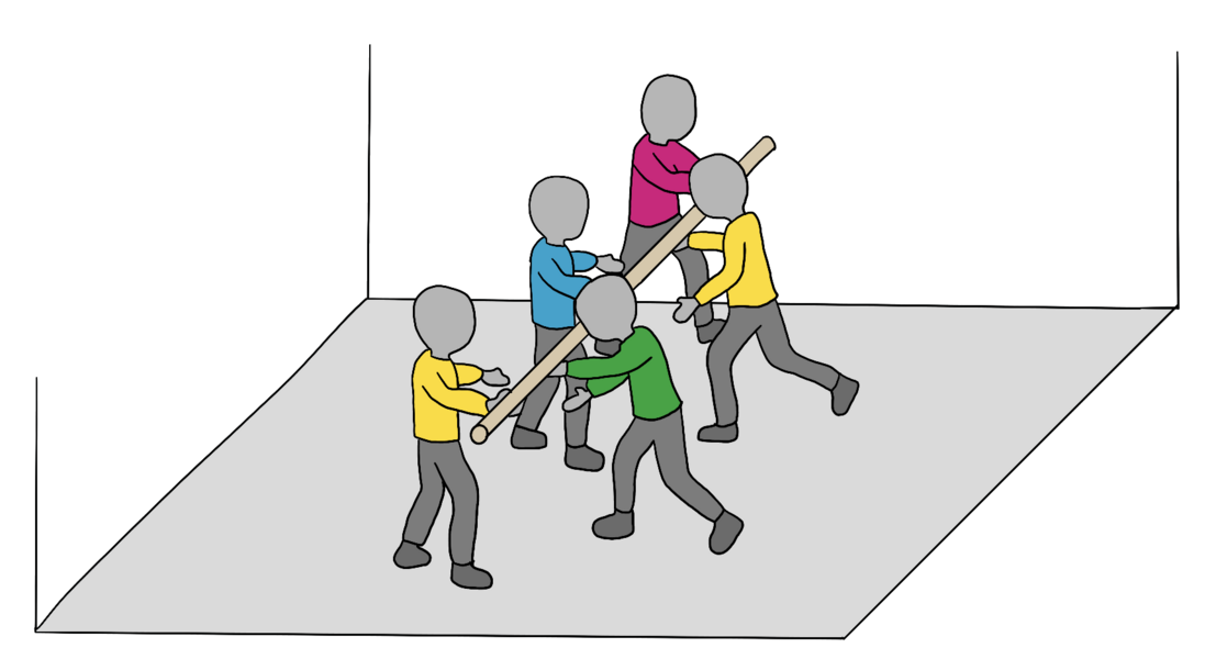 Könnt ihr den Zauberstock halten? Der magische Zauberstock verzaubert alle – doch steckt dahinter nur ein “simpler” Trick. Kannst du deine innerlichen Impulse beeinflussen und steuern? Die Übung ist ideal geeignet, wenn es darum geht, die Konzentration und Selbstorganisation/ -beherrschung zu trainieren. Das Ziel, den Stab auf dem Boden abzulegen ohne den Verlust an Fingerkontakt, ist nur durch eine klare Fokussierung, dem zielorientierten Handeln und der effektiven Kommunikation im Team erreichbar.