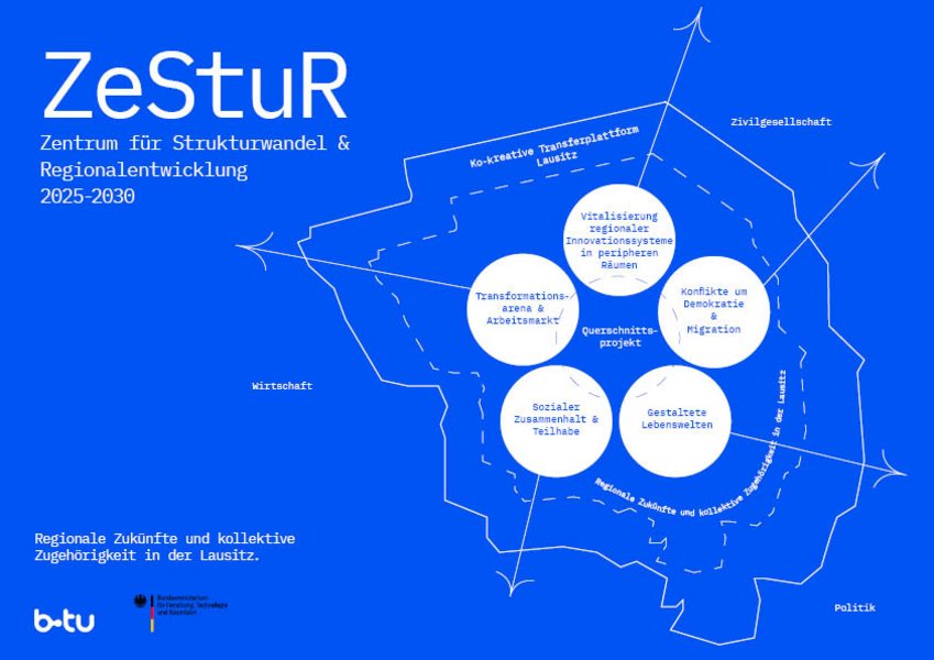 ZeStuR ist ein Projekt der BTU Cottbus-Senftenberg, das unter anderem zur Erforschung von bestehenden Herausforderungen aufgrund des Strukturwandels in der Region und zur Erschließung von Unterstützungsmöglichkeiten für eine gelingende Transformation - sowohl auf gesellschaftlicher als auch wissenschaftlicher Ebene - initiiert wurde. In dem Projekt gibt es 5 Cluster, die sich jeweils aus verschiedenen Disziplinen und Fakultäten zusammensetzen und sich inhaltlich unterschiedlichen Schwerpunkten widmen.