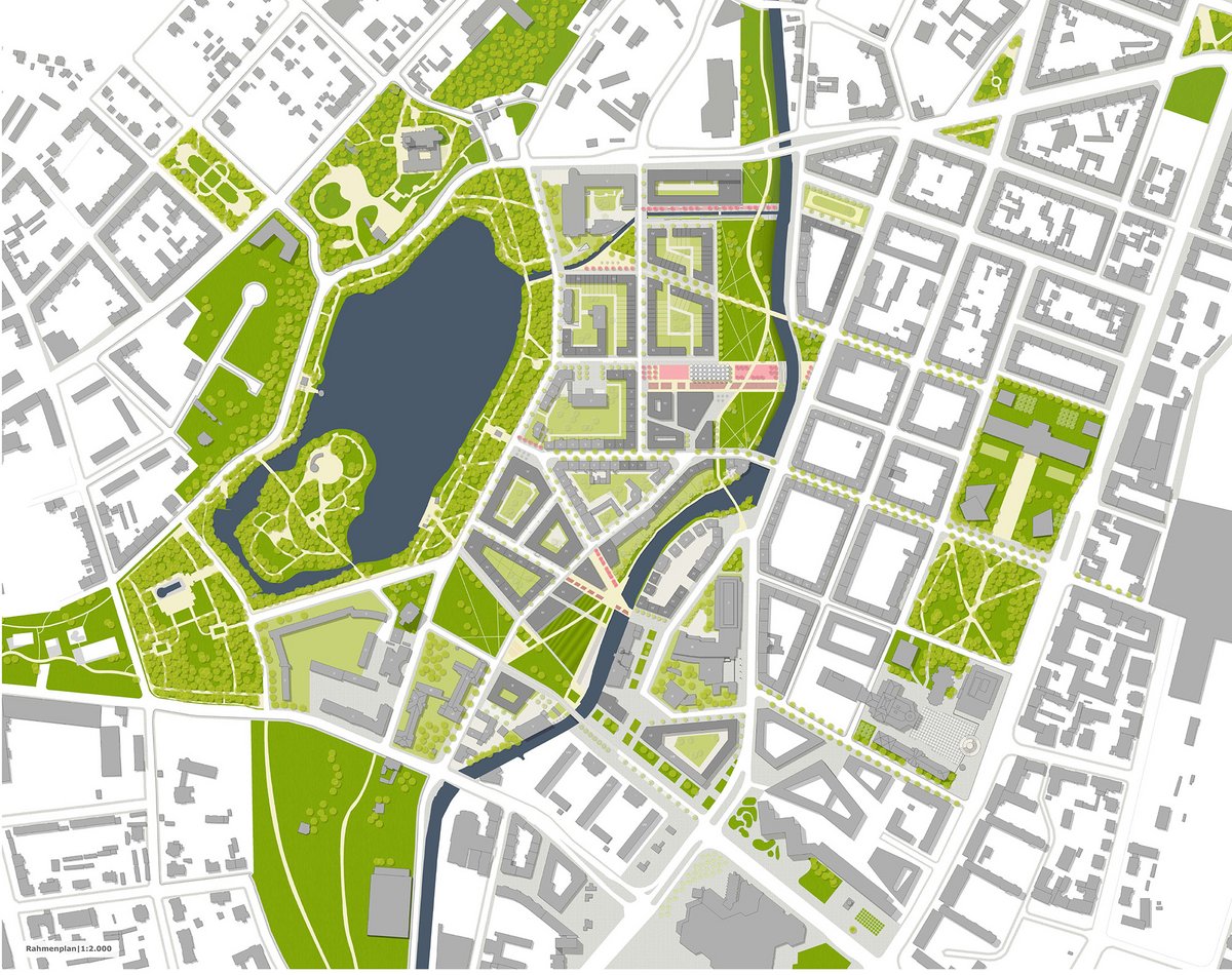 Die hier gezeigte Arbeit von Maria Feil und Sophia Klauke behandelt den nördlich an die Chemnitzer Altstadt angrenzenden Stadtteil „Am Schloßteich“, der seit der Zerstörung im 2. Weltkrieg und der nachfolgend einhergehenden Transformation des Stadtraumes durch die Nachkriegsmoderne, die Reste einer sehr heterogenen Bebebauungsstruktur aufweist. Primäres Ziel ist die Heranführung der Stadt an den Fluss durch Qualifizierung der Freiraumstrukturen und die behutsame Nachverdichtung der vorhandenen Stadt- und Raumstrukturen.