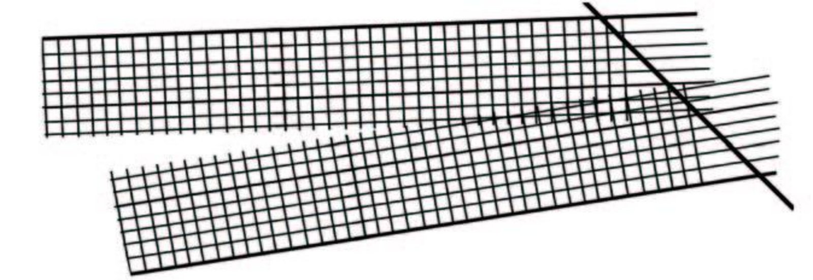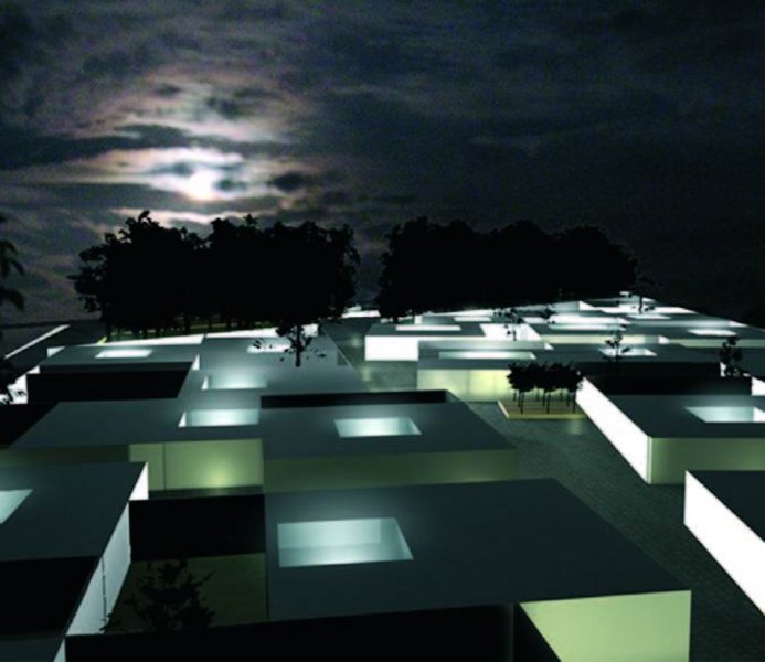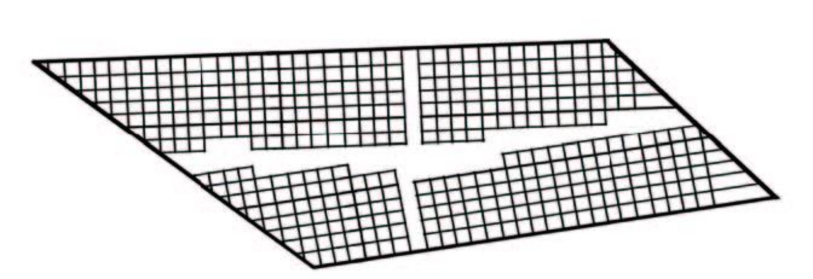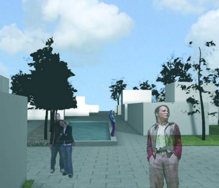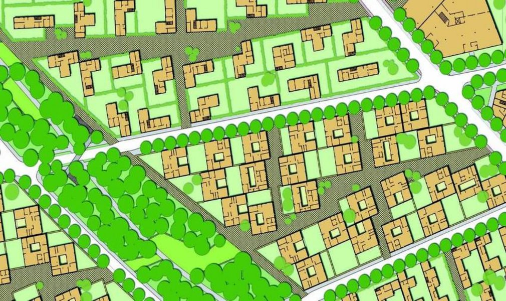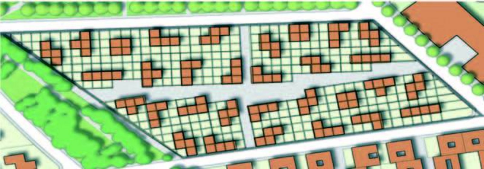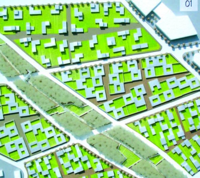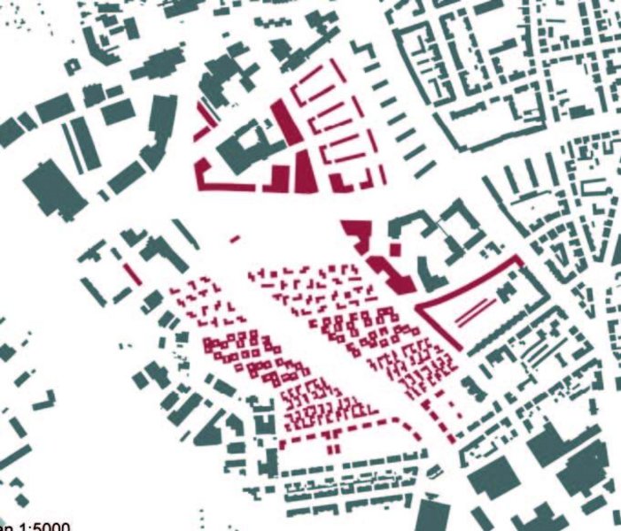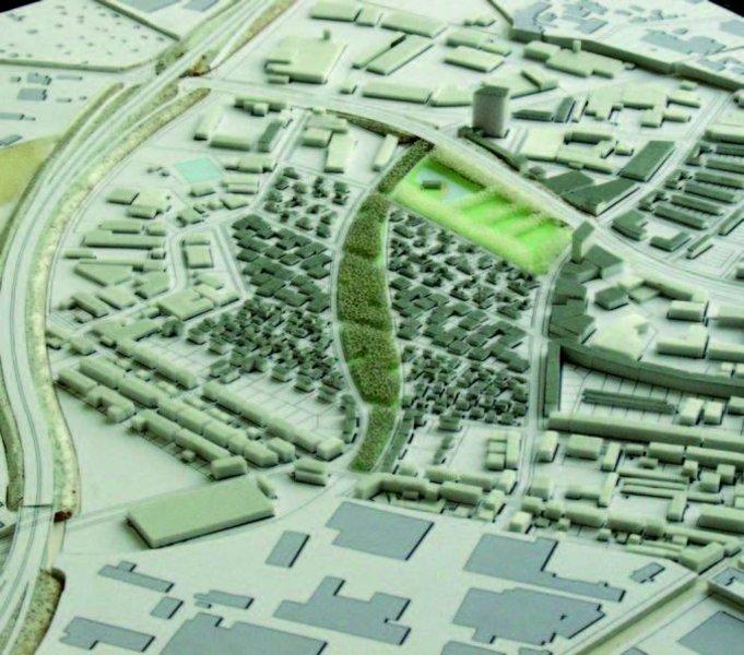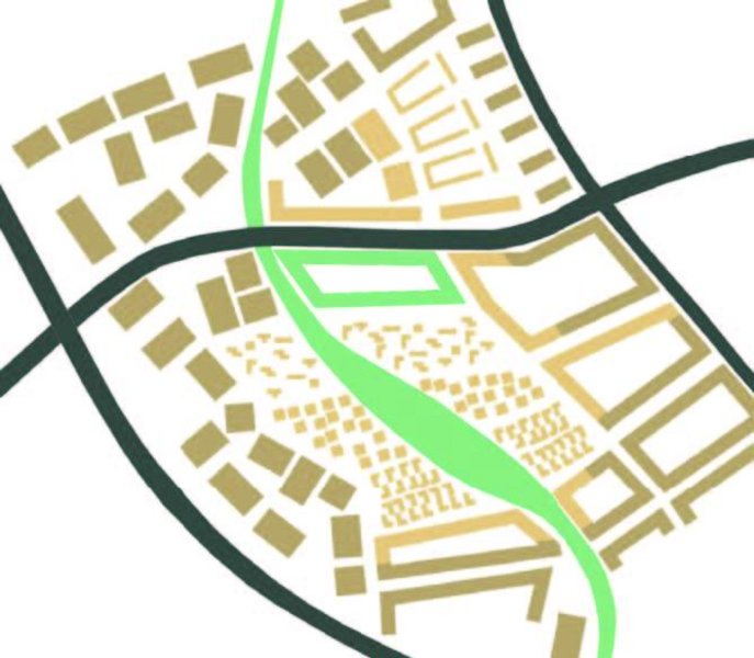 Ausgehend von der Bahnfläche, die wir unter Einbezug identitätsbildender industrieller Relikte (Schienenfragmente, Fußgängerbrücke) zu einem dichten Wald umgestalten, erstrecken sich nach Westen und Osten streifenartig drei Bebauungsfelder. Diese Felder sind kontrolliert nach einem geometrischen Prinzip entwickelt: Der keilförmige Zuschnitt der Streifen wirkt sich nicht auf die (rechtwinklige) Parzellierung aus, sondern lässt im Inneren der Baufelder einen räumlich abwechslungsreichen Freiraum entstehen, der im Sinne holländischer Wohn-Erften mit Vor- und Rücksprüngen versehen ist und einen Spielstraßencharakter hat. Daher erfolgt dort auch keine Differenzierung zwischen Fußgänger- und Verkehrsflächen.