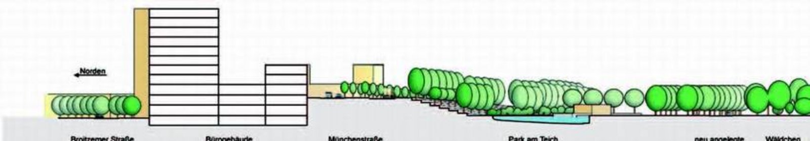 Da sie als eine der Haupteinfallstraßen Braunschweigs ihrer Funktion als städtebaulich ausformulierter Stadteingang noch nicht nachkommt, soll sie ab der Ringbahnbrücke räumlich gefasst werden: Zum einen durch (im Gegensatz zum Waldstrang) künstliche und damit städtisch wirkende Baumreihen südlich der Straße, vor allem aber durch straßenbegleitende Bebauung im Norden und am Arbeitsamt, die mit zwei integrierten Hochpunkten urbane Akzente setzt. Die bauliche Einfassung der Straße und die distanzschaffende Weite des künstlich gestalteten Grünraums haben auch den Zweck, die Lärmeinflüsse auf das Umfeld zu mindern.