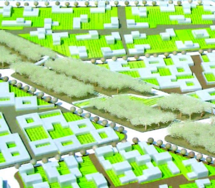 Straßenbegleitende Bebauung befindet sich derzeit bereits am südlichen Teil des Cyriaksrings und an den Blöcken der Hugo-Luther-Straße. Diese gründerzeitartigen Strukturen werden, ebenso wie die Blöcke des Arbeitsamts und der Zeilen am nördlichen Cyriaksring, mit Bebauung ergänzt, deren Formensprache sich am Bestand orientiert. Daher wird auch nach innen, zur "Eigenheim-Vorstadt", eine urbane räumliche Kante gebildet.