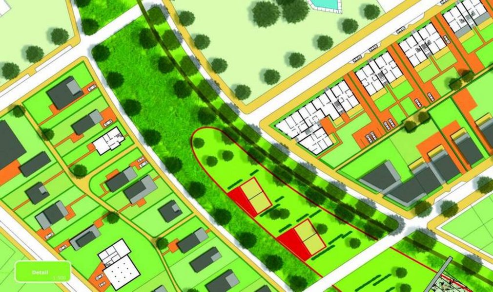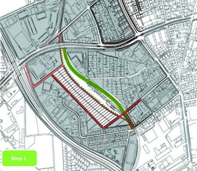 - In Schritt 1 wird einerseits eine bessere Erschließung des westlichen Kleingewerbegebietes ermöglicht, anderseits wird für die weitere Entwicklung das Gebiet um die Einfamilienhäuser erschlossen und parzelliert. Als Initiator für das gesamte Gebiet wird der "Grüne Boulevard" und der verbindende (Nord/Süd) Radweg angelegt. Die Struktur der Kleingärten bleibt erhalten.