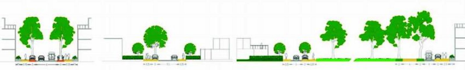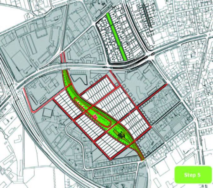 - In Schritt 2 wird die östliche Seite der "Grünen Mitte" erschossen und parzelliert um den städtischen Charakter fortzuführen und eine städtische Kante entlang des Boulevards auszubilden. Des Weiteren entsteht ein Abschnitt des Grünraumes, der Bereich Kultur um den alten Bahnhof.