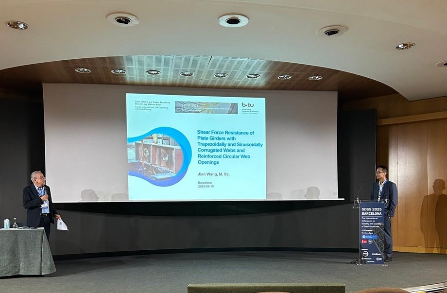 Auf der International Conference on Stability and Ductility of Steel Structures 2025 in Barcelona präsentierte Jian Wang seinen neuesten Beitrag zum Thema „Shear Force Resistance of Plate Girders with Trapezoidally and Sinusoidally Corrugated Webs and Reinforced Circular Web Openings“.
