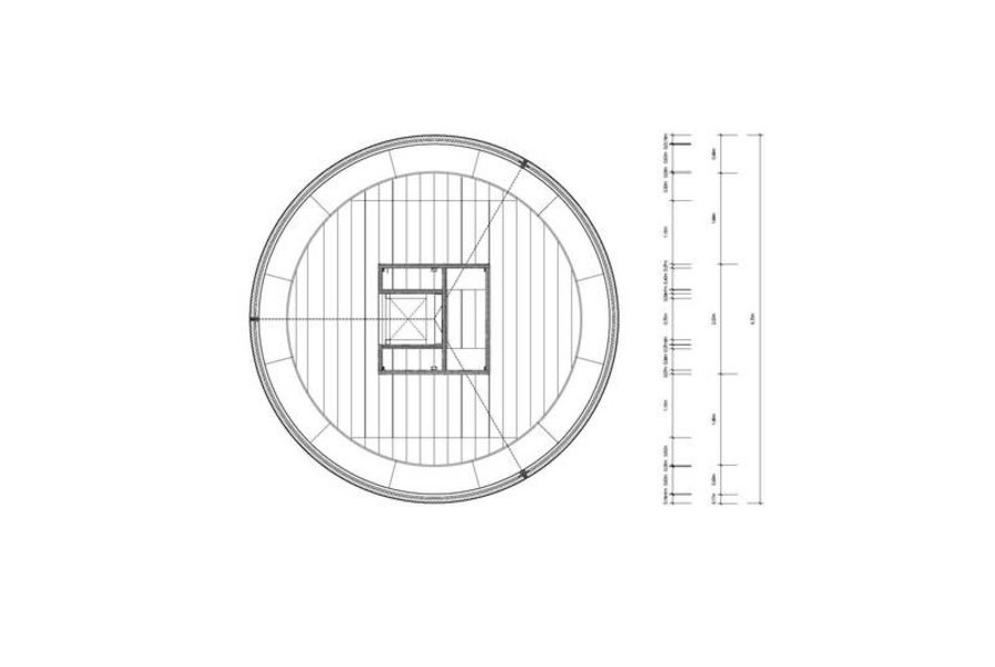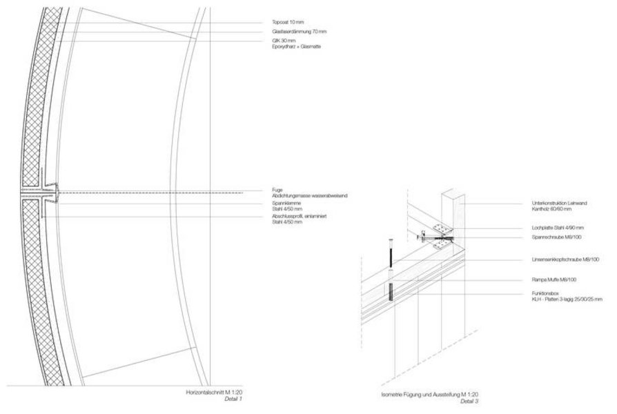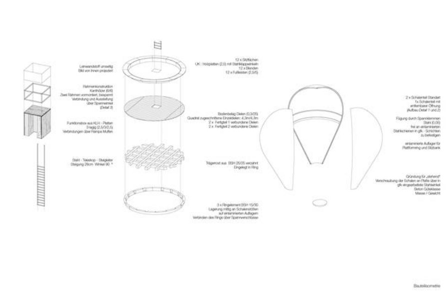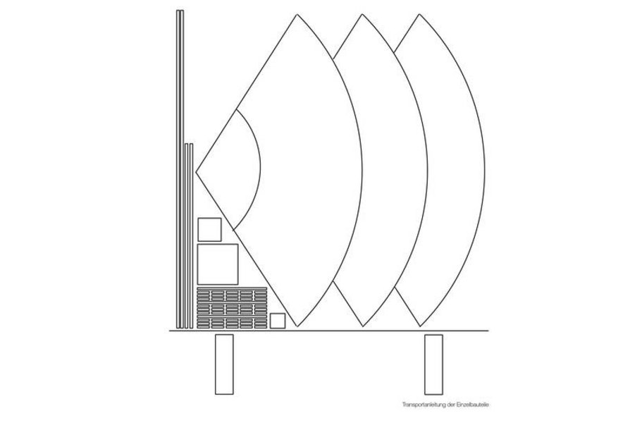 Eine Funktionsbox aus vorgefertigten KLH-Platten wird mittig auf die Plattform gesetzt. Im Sinne der Transportabilität sind alle Verbindungen, ausgenommen der Stahlklemmen der Schalen, durch Muffenverbindungen mit einheitlichen Schraubengrößen hergestellt. Das 22403 kann somit beliebig oft auf- und abgebaut werden.