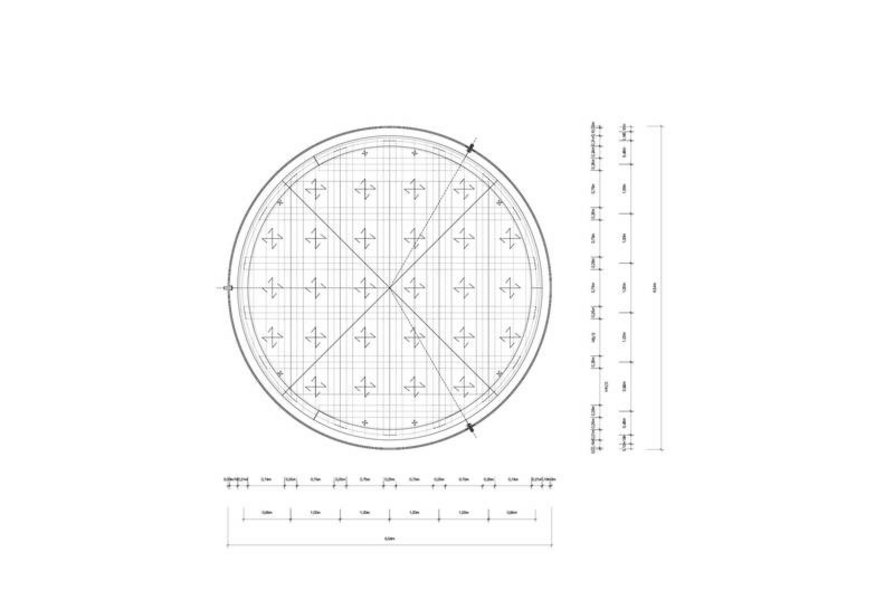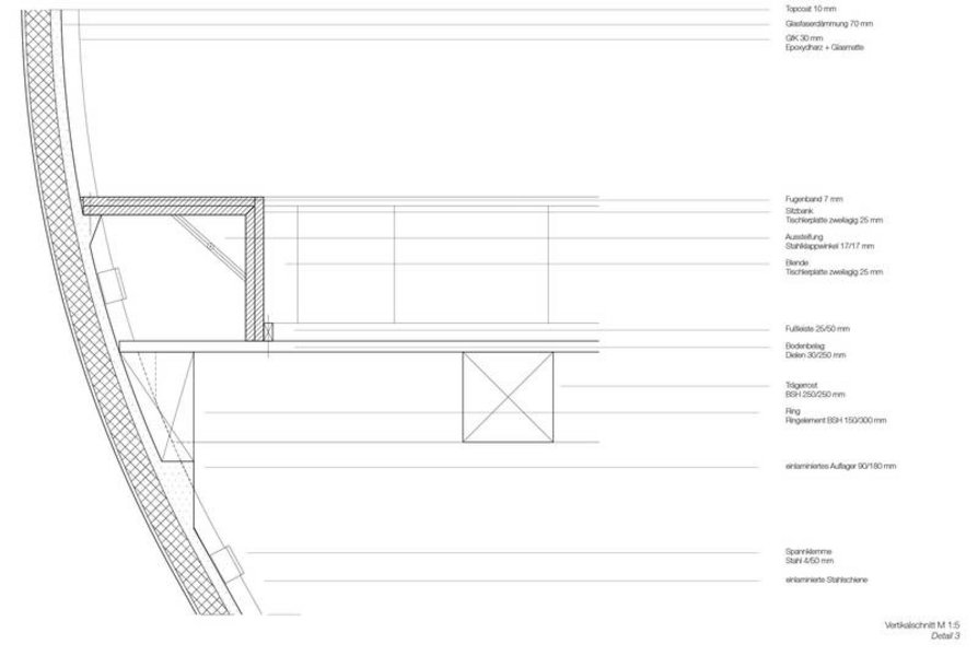 Die Konstruktion der Besucherplattform besteht aus einem Rost aus BSH-Bindern, welche auf in den Schalen einlaminierten Ringauflagern aufgelegt werden. Holzdielen als Bodenbelag steifen den Rost aus.