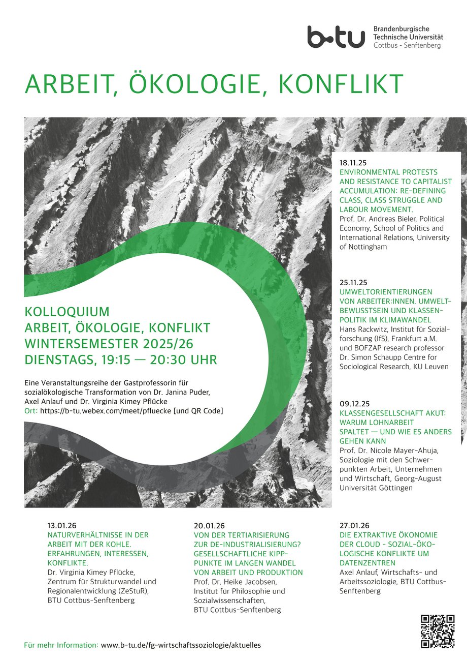 Dr. Janina Puder, Gastprofessorin für sozialökologische Transformation, Dr. Virginia Kimey Pflücke und Axel Anlauf von der BTU Cottbus-Senftenberg laden ein zu einer Online-Veranstaltungsreihe mit sechs Vorträgen samt Diskussion um Themen der aktuellen Arbeitssoziologie in Zeiten gesellschaftlicher Transformation.
