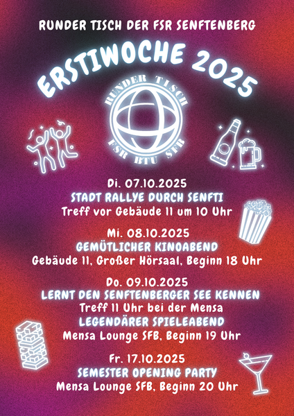 Der FSR Senftenberg lädt euch herzlich zur ultimativen Welcome-Week ein. Ob Rallye durch „Senfti“, Kinoabend, Spieleaction oder die große Semester Opening Party – hier ist für alle etwas dabei.