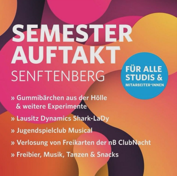 Der Abend bietet einige Programm-Highlights. Wir als FSR sind auch vor Ort und stellen ein paar Experimente vor. Weiterhin gibt es einen Auftritt des studentischen Teams Lausitz Dynamics mit "Shark LaDy" auf vier Rädern. Auch Künstler*innen der neuen Bühne präsentieren Ausschnitte neuer Produktionen. Zudem gibt es einen Auftritt des Jugend-Musical-SpielClubs und es werden Freikarten für die nB ClubNacht am 26. Oktober verlost.