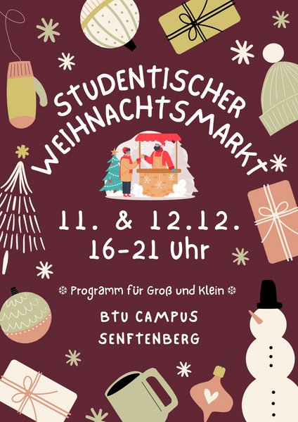 - Weihnachtsmarkt auf dem Campus Senftenberg (13.12 und 14.12, jeweils von 16:00 bis 20:00 Uhr)