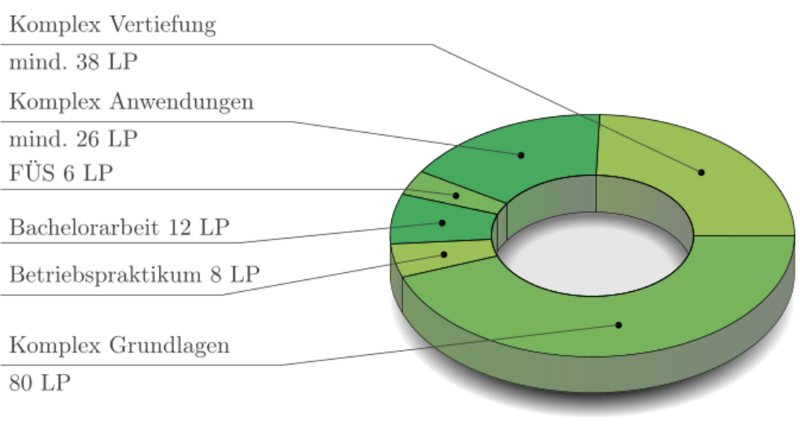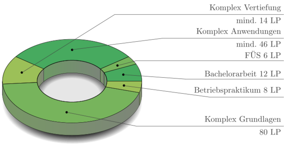 Für die Bachelorstudiengänge Mathematik und Wirtschaftsmathematik müssen in sechs Semestern insgesamt 180 Leistungspunkte (LP) erbracht werden. Die einzelnen Module sind Modulbereichen zugeordnet und in der Studienordnung ist festgelegt, wie viele Leistungspunkte in welchem Modulbereich erbracht werden müssen. In den folgenden Abbildungen kannst du die einzelnen Modulbereiche und die entsprechenden LP-Zahlen erkennen. Die beiden Studiengänge sind dabei sehr ähnlich, lediglich im Komplex »Anwendungen« und im Komplex »Vertiefung« gibt es einige Unterschiede.