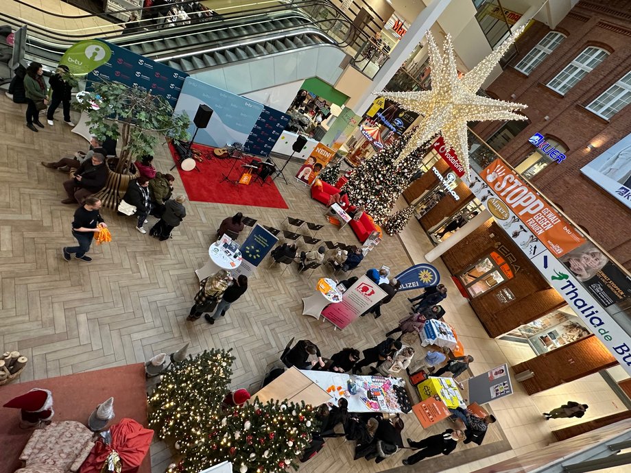 Im Anschluss an die Fahnenzeremonie fand von 15 bis 18 Uhr eine begleitende Veranstaltung im BlechenCARRÉ statt. Neben moderierten Gesprächen mit den lokalen Akteur*innen im Bereich Gewaltprävention und Beratung, gab es u.a. kreative Angebote für Kinder. Dank der finanziellen Unterstützung durch das Gleichstellungsbüro der BTU rundete eine musikalische Darbietung der Band „Pubalabub“ die Veranstaltung ab. Zu den teilnehmenden Akteurinnen gehörten neben der BTU Cottbus-Senftenberg auch die Fachstelle Gewaltprävention, Amnesty International Cottbus, das Frauenzentrum Cottbus e.V. mit MiA, das Frauenhaus Cottbus, der Deutsche Gewerkschaftsbund, der Weiße Ring, die Polizei und die Koordinatorin für Kinderschutz der Stadt Cottbus.