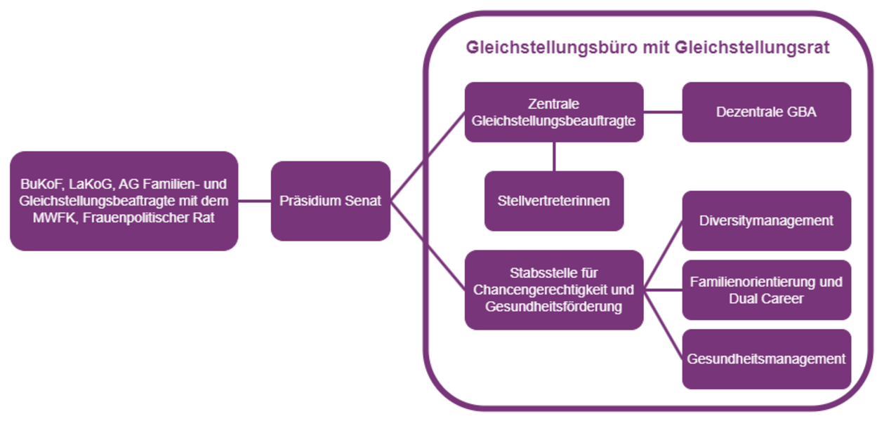 Die zentrale Gleichstellungsbeauftragte und ihre Stellvertreterinnen sowie alle dezentralen Gleichstellungsbeauftragten und deren Stellvertreterinnen sind die ständigen Mitglieder im Gleichstellungsrat. Dieser trifft sich mindestens 2-3 mal im Jahr. Als ständige Gäste nehmen auch die Referent*innen für Diversity, Dual Career, Familie und Gesundheit an den Sitzungen teil. Der Gleichstellungsrat sichert seine eigene Professionalisierung durch vielfältige Qualifizierungen und einen vertrauensvollen kollegialen Austausch. Er ist lt. Grundordnung der BTU § 19 Abs. 5 fest an unserer Universität verankert.