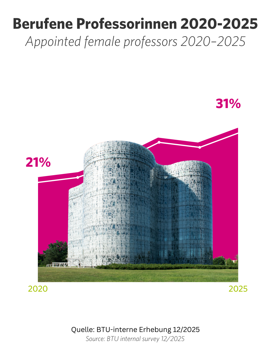 In den vergangenen fünf Jahren hat die BTU Cottbus-Senftenberg den Anteil von Professorinnen um 10 % erhöht.1 Diese positive Entwicklung ist maßgeblich der Unterstützung durch das Professorinnenprogramm III zu verdanken. Das Programm, finanziert durch das Bundesministerium für Forschung, Technologie und Raumfahrt, förderte während der Laufzeit von 2022 bis 2026 gezielte Maßnahmen zur Erhöhung des Frauenanteils in Professuren, Gremien und Führungspositionen. Zu diesen Maßnahmen zählten unter anderem die aktive Rekrutierung herausragender Wissenschaftlerinnen, die Implementierung von gendergerechten Berufungsverfahren, die Förderung von Vernetzungsmöglichkeiten für Professorinnen sowie die Sensibilisierung der Hochschulleitung und der Gremien zu den Themen Chancengerechtigkeit, Diversität und Nichtdiskriminierung. Ziel dieser Initiativen war es, einen nachhaltigen Kulturwandel und Geschlechtergerechtigkeit zu fördern.