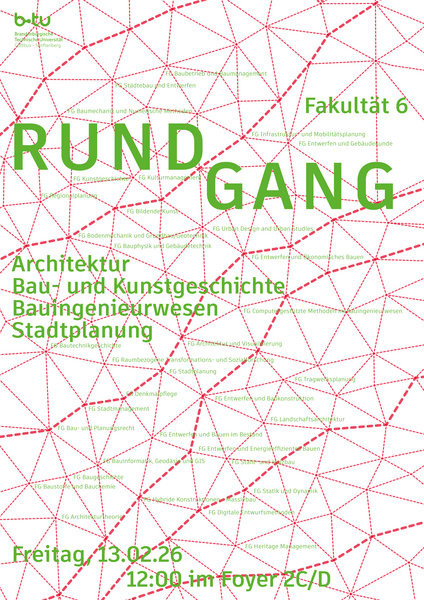 Zum Semesterabschluss lädt die Fakultät 6 am 13.02.2026 zum Rundgang ein. Studierende aus den Studiengängen der Institute Architektur, Bau- und Kunstgeschichte, Bauingenieurwesen sowie Stadtplanung präsentieren ihre Entwürfe, Skizzen, Modelle und Arbeiten des aktuellen Wintersemesters.